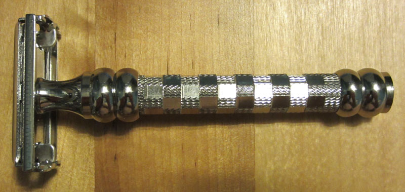 The handle itself is comfortable to hold, and the machined chequerboard pattern makes it near impossible for it so slip even with wet and soapy fingers. It’s a quite long handle, so if all you’re used to are short handled razor it might take a while getting used to – on my hand I seem to prefer the longer handled razors, so to me the length was a plus.