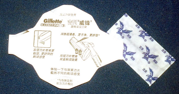 As an offside, the Gillette Vector mentioned in the advertisement seems to be a Far East clone / remake of the Gillette Sensor; pivoting head, two blades, lubrication strip and ‘micro fins’.