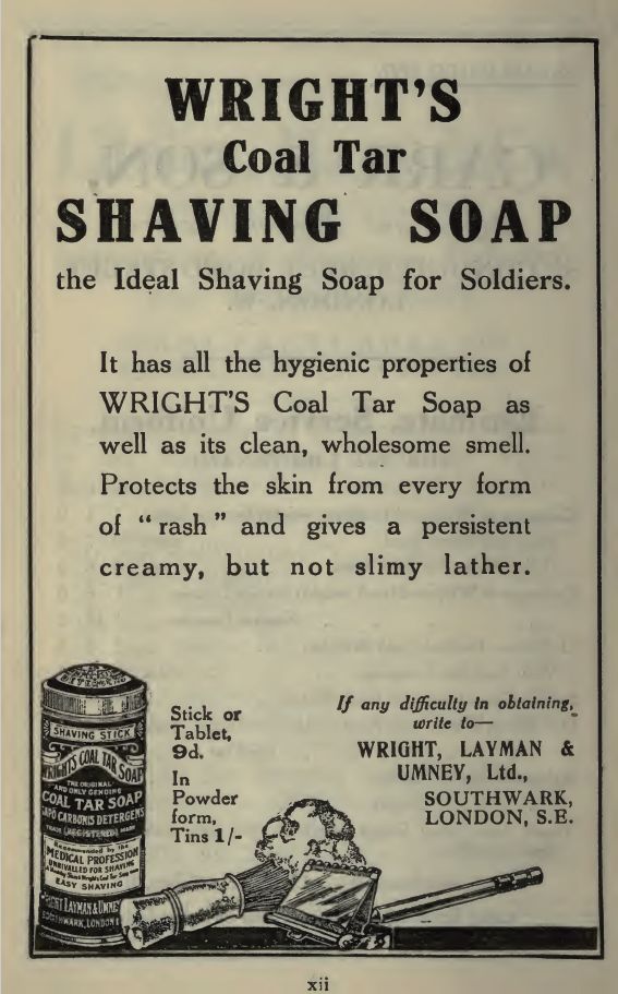 …the ideal shaving soap for soldiers – at least according to an advertisement in the book “Knowledge for War; every Officer’s handbook for the front” fourth edition published 1916.
