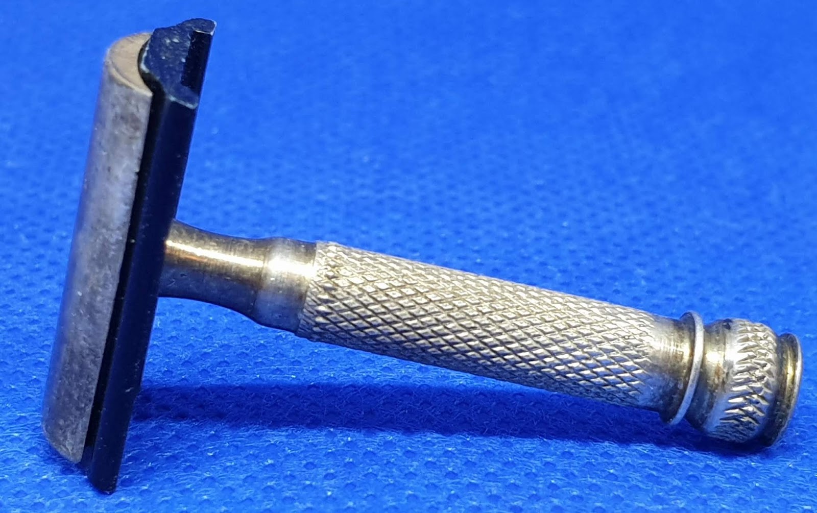 The razor itself is indeed small – as can be seen from the photos – and the blades are downright tine. The design seems to be a scaled down version of the Laurel “Dumb Bell” Razor from 1934, which sort of gives a lower end to when the Ladies Boudoir was manufactured. There is some indications online that the Ladies Boudoir was meant as an cosmetic razor, ie.: for trimming eyebrows and removing unsightly hairs, rather than for shaving armpits and the like.