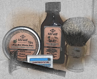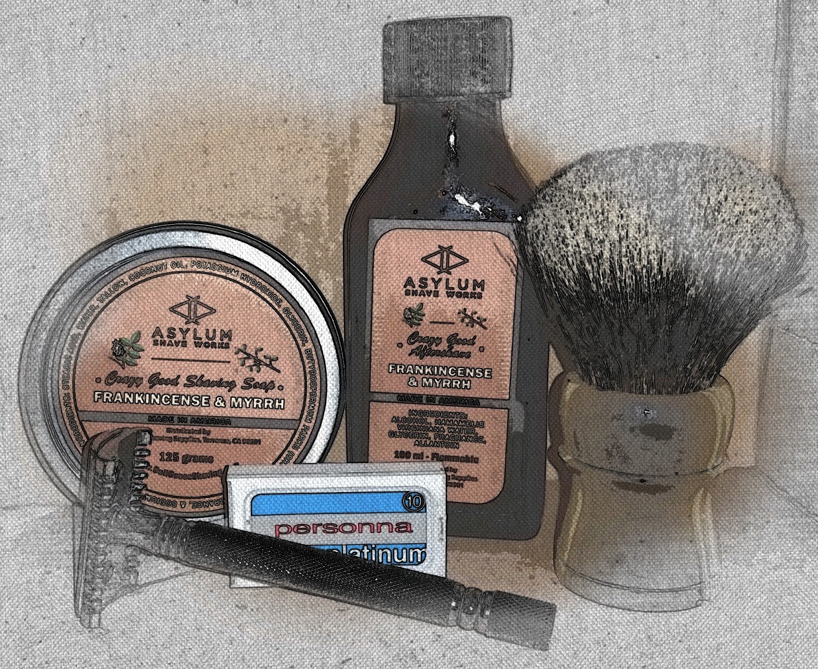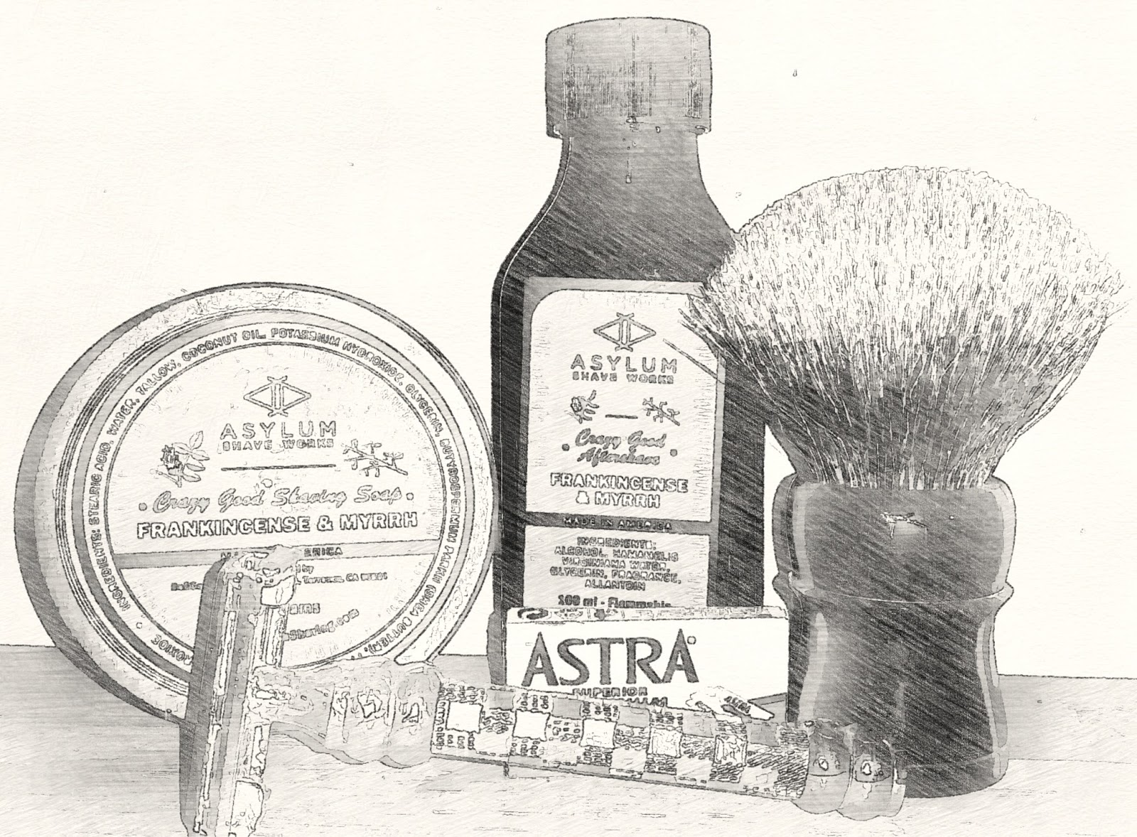 Post-shave: Cool water rinse, alum, Asylum Shave Work Frankincense & Myrrh