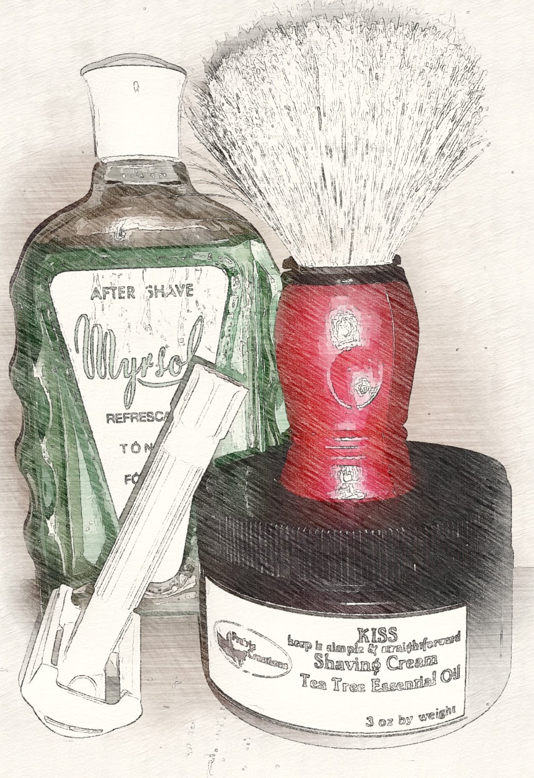 Post-shave: Cool water rinse, alum, Krampert’s Finest Bay Rum Aftershave