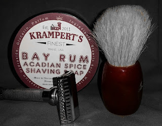 Post-shave: Cool water rinse, alum, and Krampert’s Finest Bay Rum Aftershave