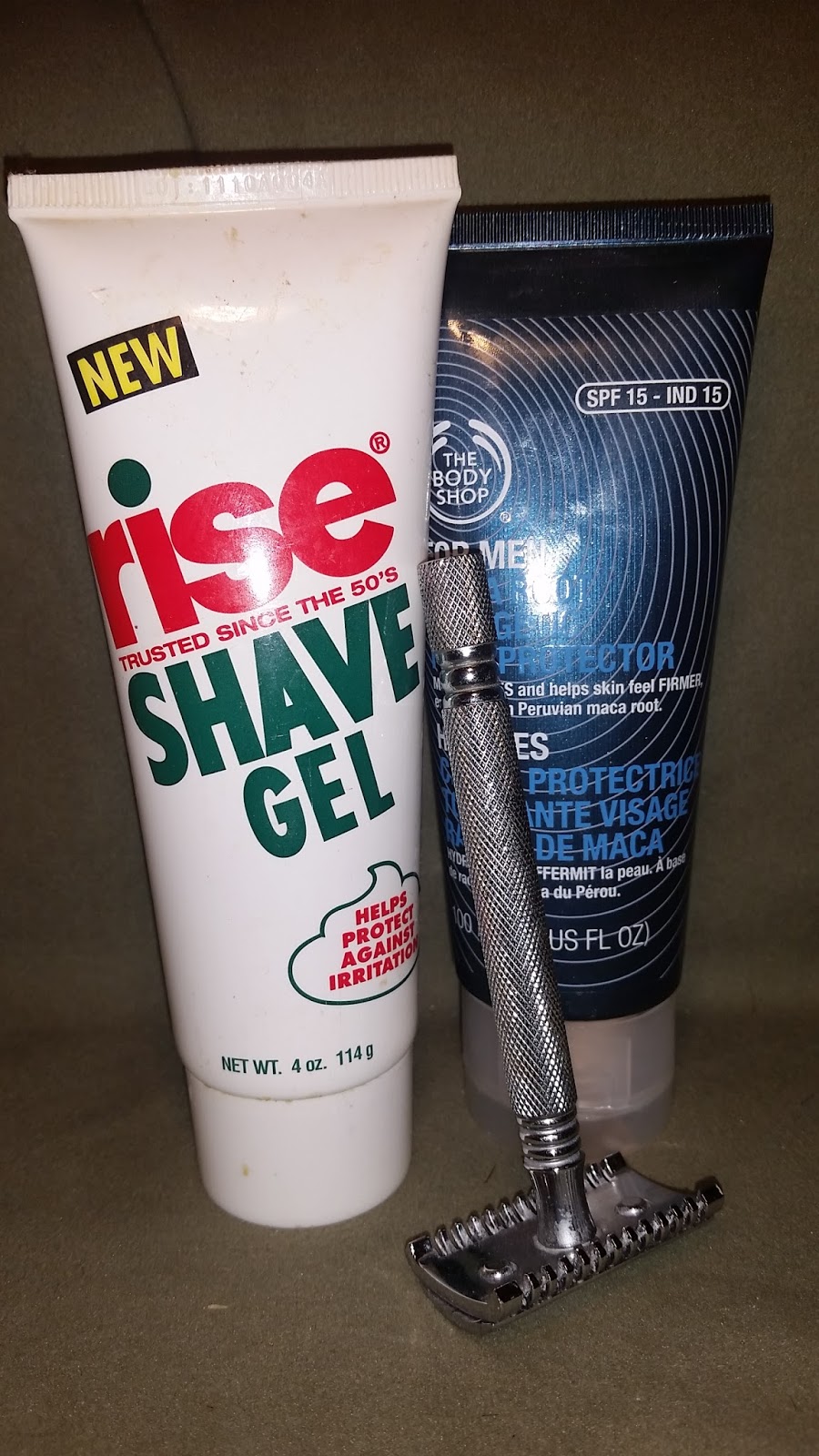 Post-shave: Cool water rinse, alum, and BodyShop Maca Root Energetic Face Protection