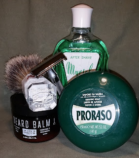 Post-shave: Cool water rinse, alum, and BodyShop Maca Root Energetic Face Protection