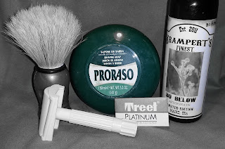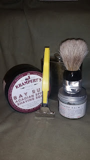 Post-shave: Cool water rinse, alum, and Krampert’s Finest Bay Rum Aftershave