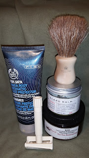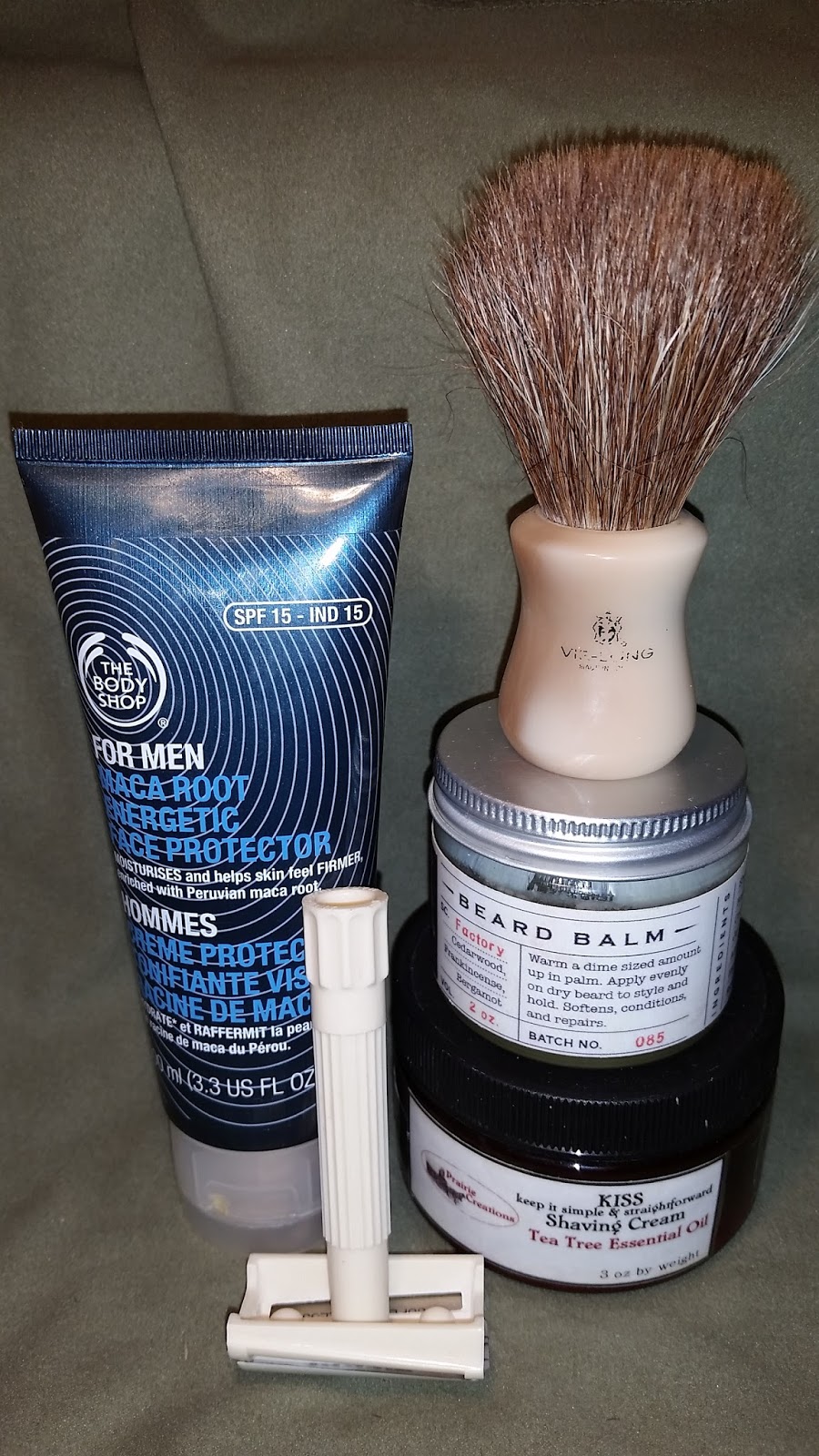Post-shave: Cool water rinse, alum, and BodyShop Maca Root Energetic Face Protection