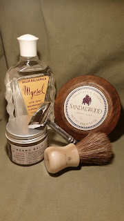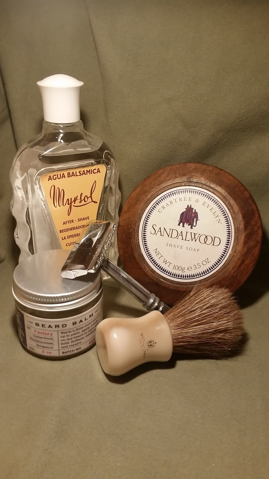 Post-shave: Cool water rinse, alum, and Myrsol Agua Balsamico