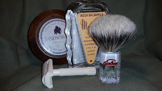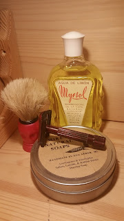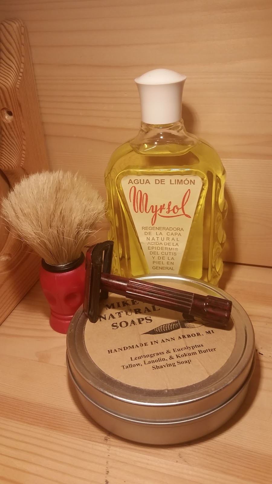 Post-shave: Cool water rinse, alum, and Myrsol Agua Balsamico