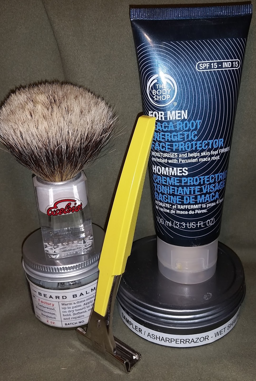 Razor: Gillette Slim with a Fresh Lord Cool – set for 7 on the first pass, and 5 on the second.