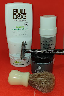 The razor is – as can be expected from a single piece, single edge razor – deceptively simple. A handle, containing a spring loaded plunger with a knob on the end to ain in blade removal. A base plate, angled, semicircular cuts in the sides, with a comb on one side as well as a shaped lug in each corner for holding the blade. Blade was inserted and removed by utilising the springiness of the steel, bending it to slip it in under and out from the corner nubs.