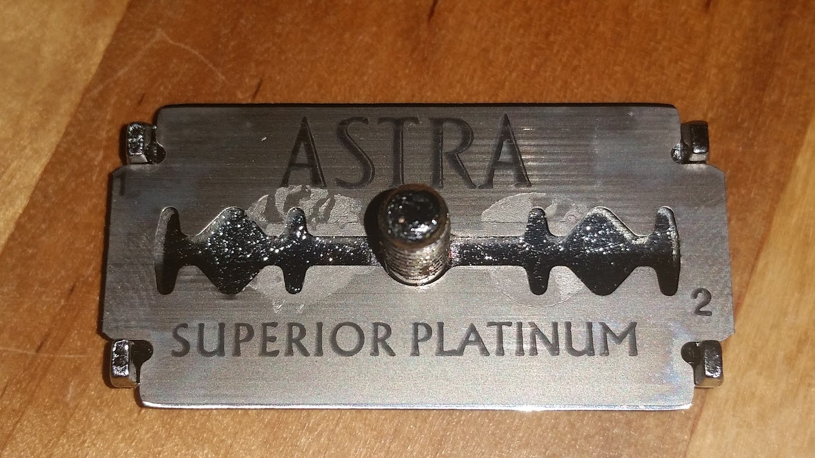 In hindsight there is a better, simpler, and cheaper way to make a razor with just one threaded stud… but I think that in order to see it you needed to be familiar with the modern DE blade; the one developed from the Probak blade with notched corners. It’s clearly shown in the cheap and cheerful razor I bought from Flying Tiger Copenhagen close to two years ago; raised corners on the cap that engage the notched corners, as the photos below shows.