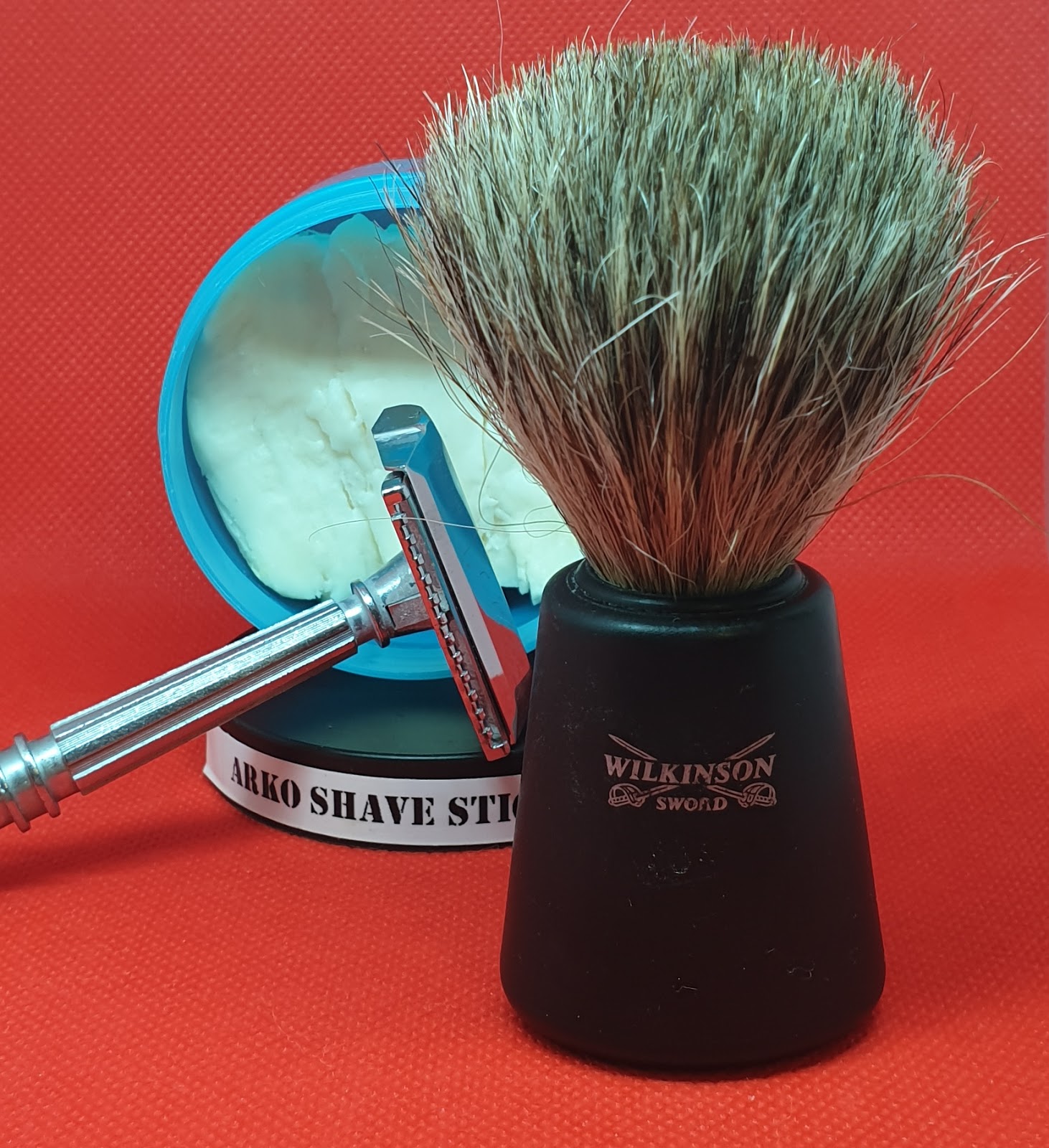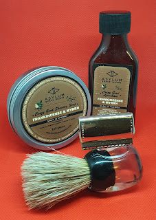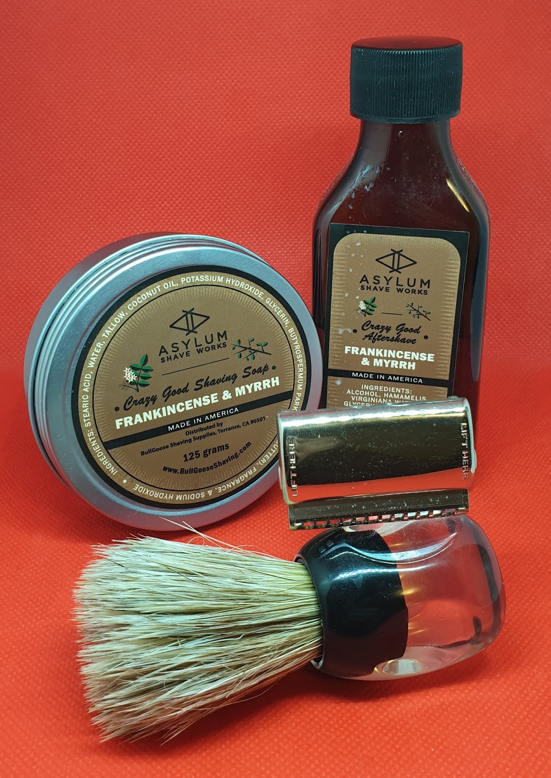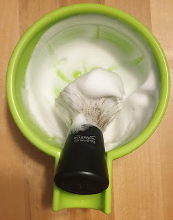 Please note: I got home after midnight, hadn’t shaved since Friday and decided to shave in the shower… no brush, just rubbed the cream around with my fingers. Used a handheld mirror, and a disposable so I wouldn’t drop a vintage razor on the tile floor. It worked, but I think I’ll reserve this way to shave for dire emergencies only… there was no Zen.