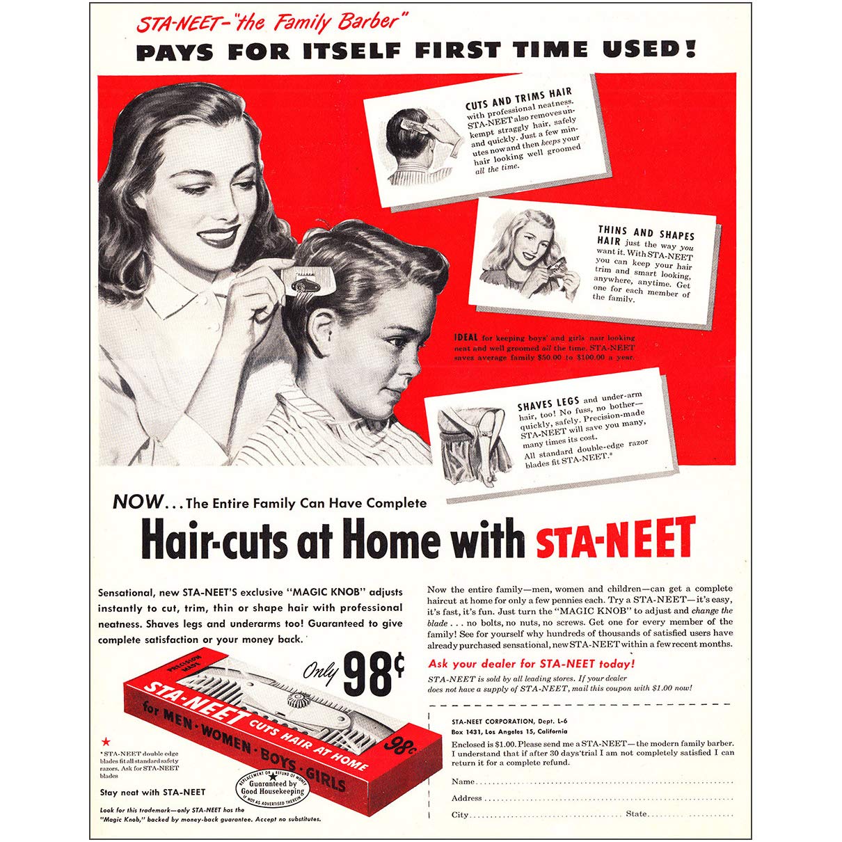 For a 98 US cents in the mid ’40s (about 14 US dollars today, give or take), I can see it as a useful tool to extend the time between going to the barber or hairdresser. I can’t see it being a complete replacement though… even less considering the fact that it seems to be made from plastic: