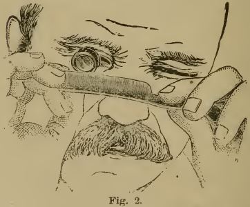 The first essential to painless and easy shaving is by use of a keen cutting razor, any of celebrated makes will do, but for ” self-shaving” none answers the purpose so well as the wedge-shaped blade, always avoiding the ” hollow-ground” or so-called ” rattlers” generally used by barbers, for the reason they arc so thin the edge will spring on a coarse beard, and will not cut so well as the thicker blades, which also hold a keen edge longer, and in all respects do better for private use. Next, after procuring a good water hone, with ” rubber,” a small slate stone always sold with the hone, and used to lubricate the hone with the aid of a sufficient amount of water, and rubbing this on the hone until a fine grit is evenly distributed over the surface. This done, and your hone placed in a firm position, you then proceed by stroking gently, the razor being placed on the side, bearing on it only sufficient to keep it firmly on the stone, drawing it from “heel to point” (the heel is the point nearest the handle, and the opposite the point), with the edge forward, and alternating the side after each stroke, and thus successively until a fine edge is obtained. If, during this process, the razor should click, jump, or give other evidence of some foreign substance between the razor and hone, it should be immediately removed by washing both hone and razor, rather than trouble looking for the mite or particle which caused it, as it will cause small “nicks” or breaks in the edge “of your razor, which you can determine by the use of a magnifying glass. Fig. I is the glass preferred by the writer for the purpose in question, and it would be always better before proceeding to use the hone, to examine the edge of the razor, as shown in Fig. V, in order to determine the amount of irregularities in the edge, then you know where to look for them, and when present, they will appear under the field of the glass as in Fig. 3.