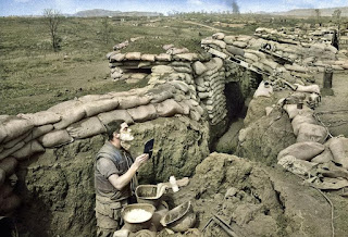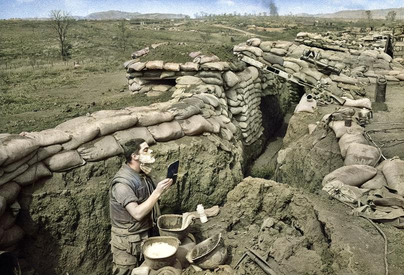 In this image from the Vietnam War, there is still a blue tint to the flak vest, although the rest of the fatigues are much closer to real life. The sandbags are a natural brown, and the lather looks white and inviting.