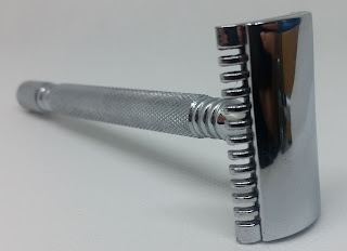 A three piece open comb razor – pretty much a case of what you see is what you get. It is heavier than I expected, since the handle is solid, not hollow like it is on many other inexpensive razors. This gives it a pleasant balance in my opinion, with the centre of gravity about 3cm below the head. The TP-01 is a bit more aggressive then the Merkur 25C OC, but still fairly mild compared to some of my other razors.