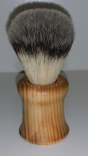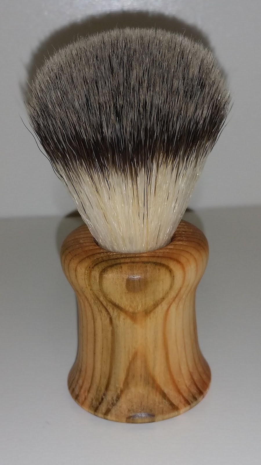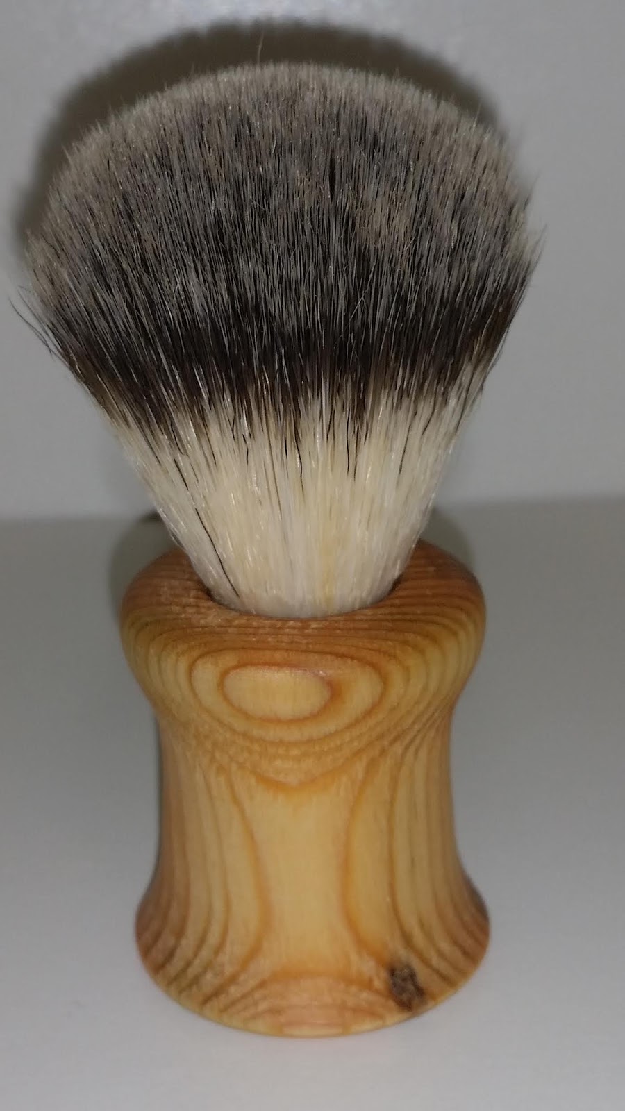 The knot is inexpensive Chinese badger from source who seems to mostly sell budget make up brushes and wigs. The handle is a piece of two-by-two construction lumber, good Norwegian spruce most likely, that have been ageing in my shed for a few years now. The finish is a mineral oil and CA glue finish, which – if my sources online can be trusted – should be at least somewhat water resistant.