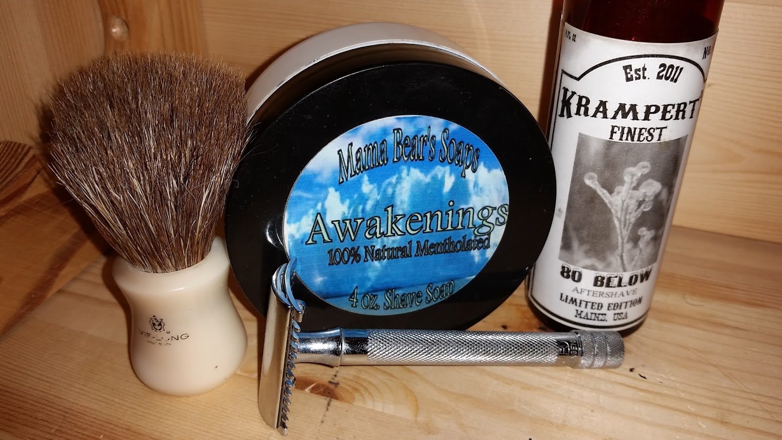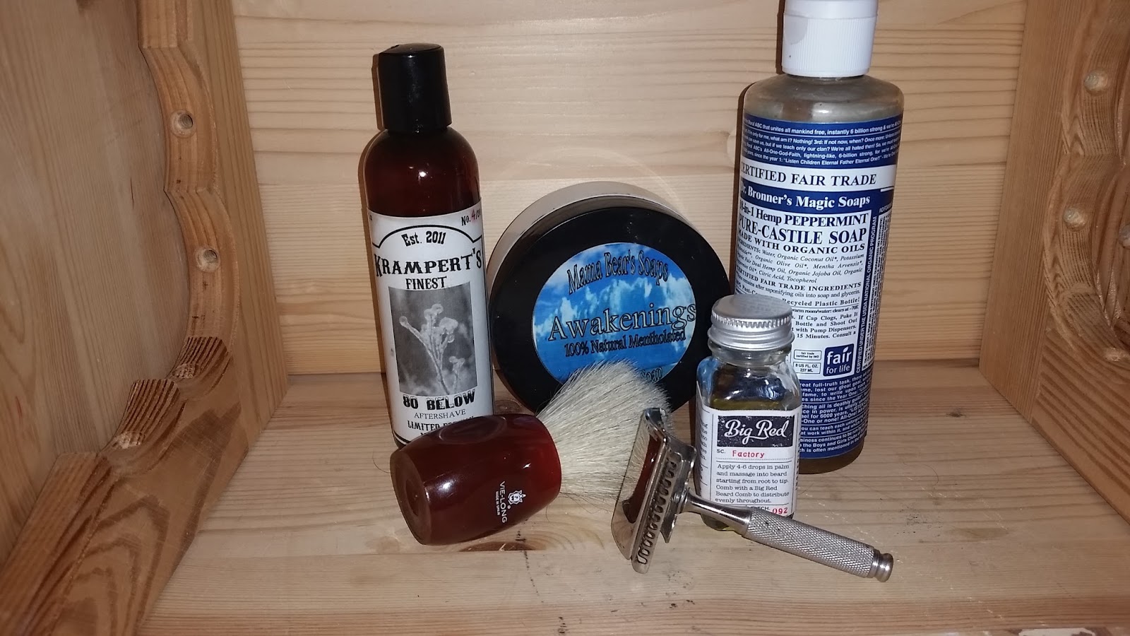 Post-shave: Cool water rinse, alum, and Krampert’s Finest 80° Below Aftershave